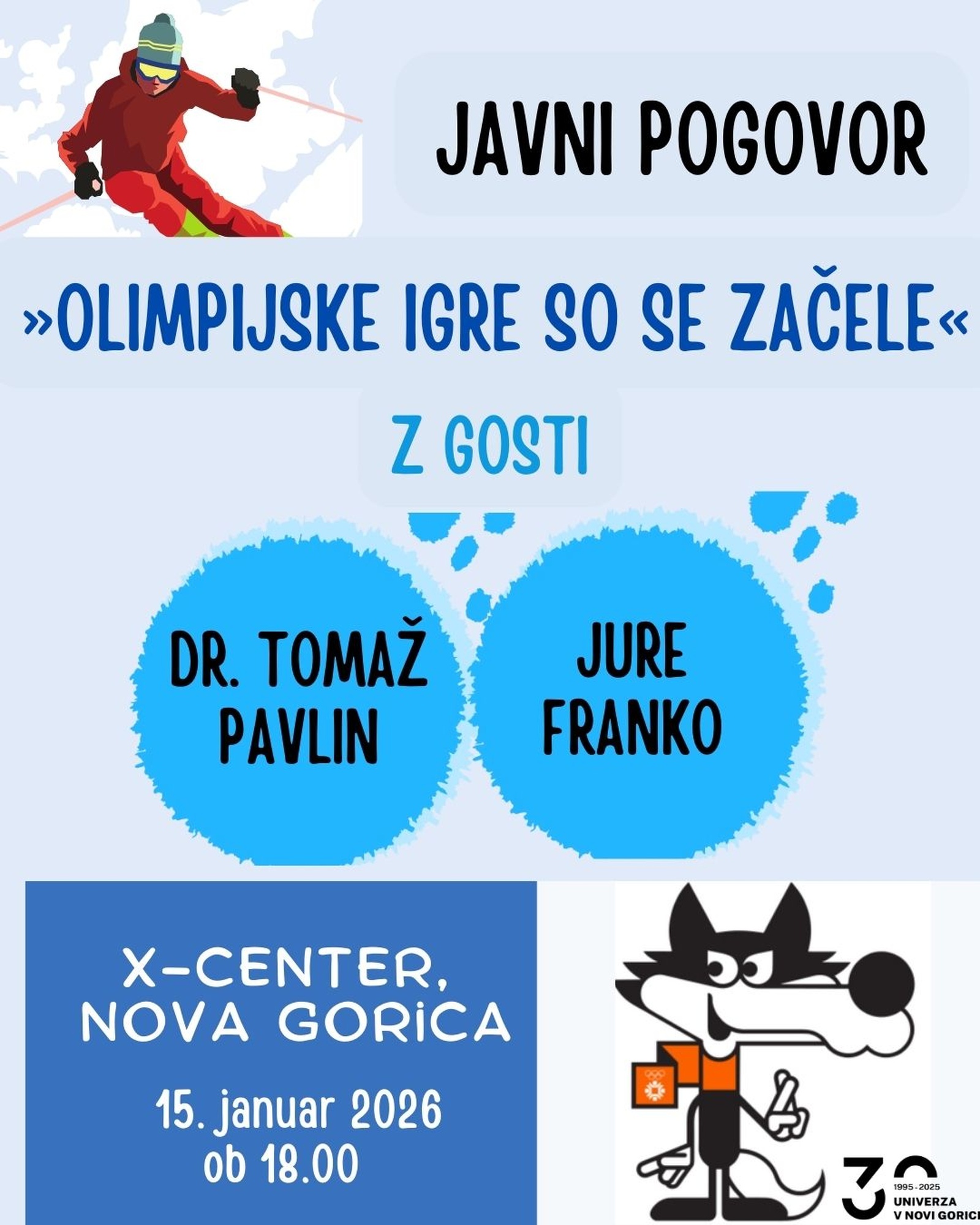 Vljudno vabljeni v Xcenter, v četrtek, 15. januarja, ob 18.00, na javno predavanje, na katerem bomo olimpijsko zgodbo pogledali od blizu, ne le skozi zgodovino, temveč tudi skozi osebno izkušnjo vrhunskega športa. Gost večera bo domačin Jure Franko, udeleženec olimpijskih iger v Sarajevu, predavanje pa bo izvajal Tomaž Pavlin, nekdanji hokejist in predavatelj na Fakulteti za šport.