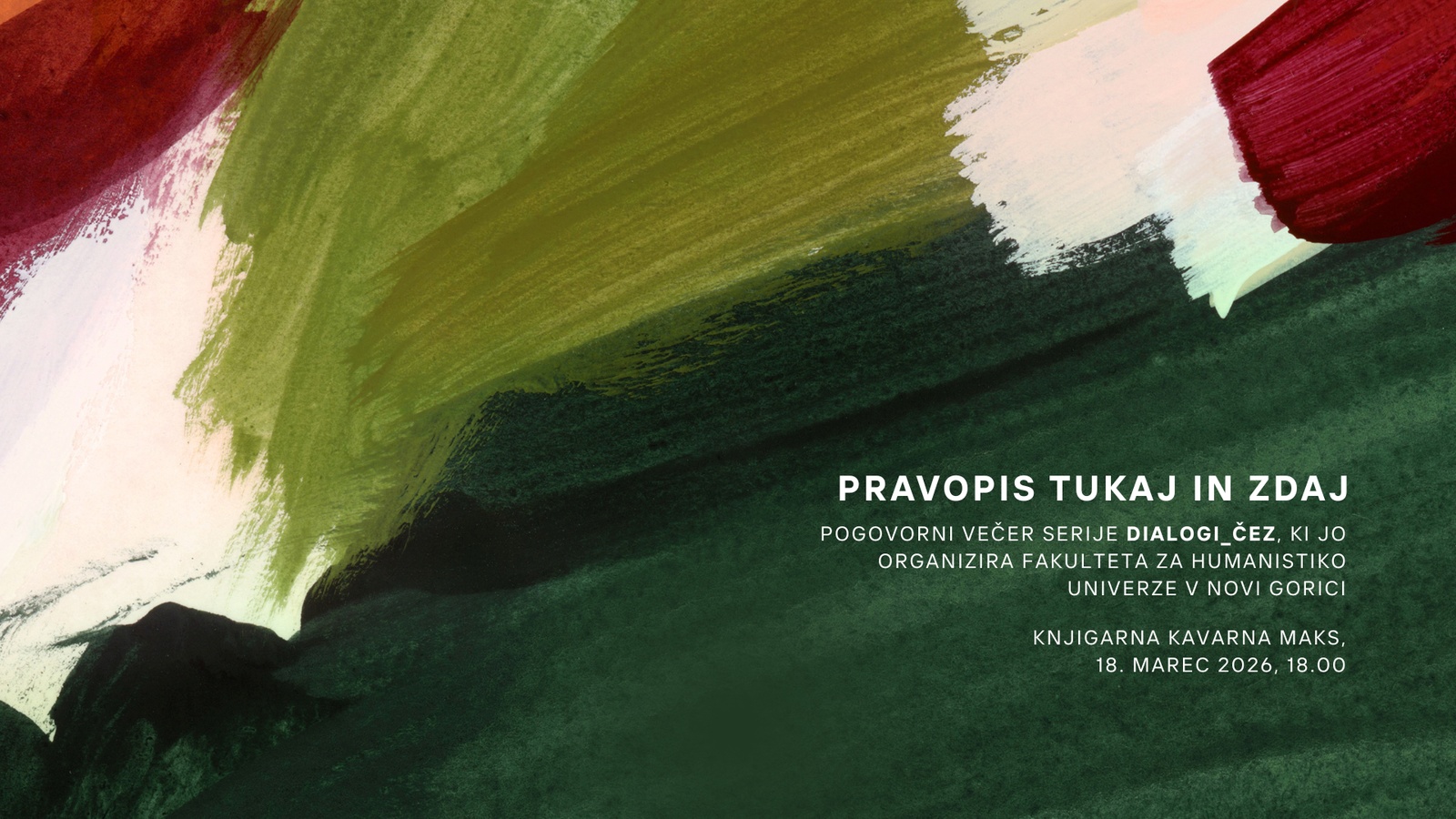 Pravopis tukaj in zdaj je pogovorni večer serije Dialogi_čez, ki jo organizirata Fakulteta za humanistiko in Center za eksperimentalno, formalno in teoretično jezikoslovje Univerze v Novi Gorici.