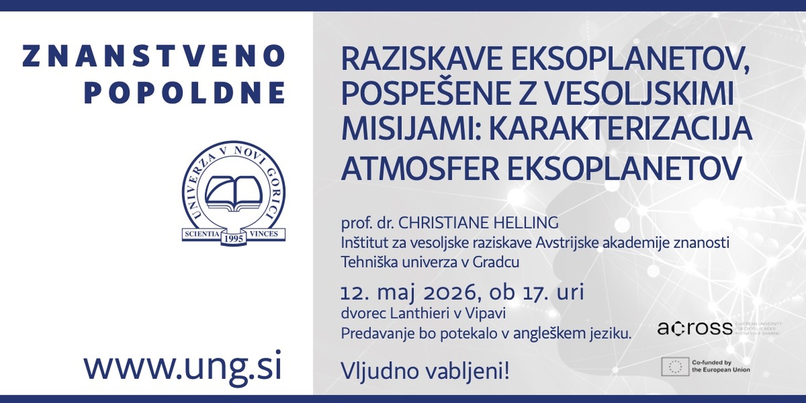 Univerza v Novi Gorici vabi na javno predavanje, ki ga bo imela prof. dr. Christiane Helling (Inštitut za vesoljske raziskave Avstrijske akademije znanosti in Tehniška univerza v Gradcu), z naslovom Raziskave eksoplanetov, pospešene z vesoljskimi misijami: karakterizacija atmosfer eksoplanetov.