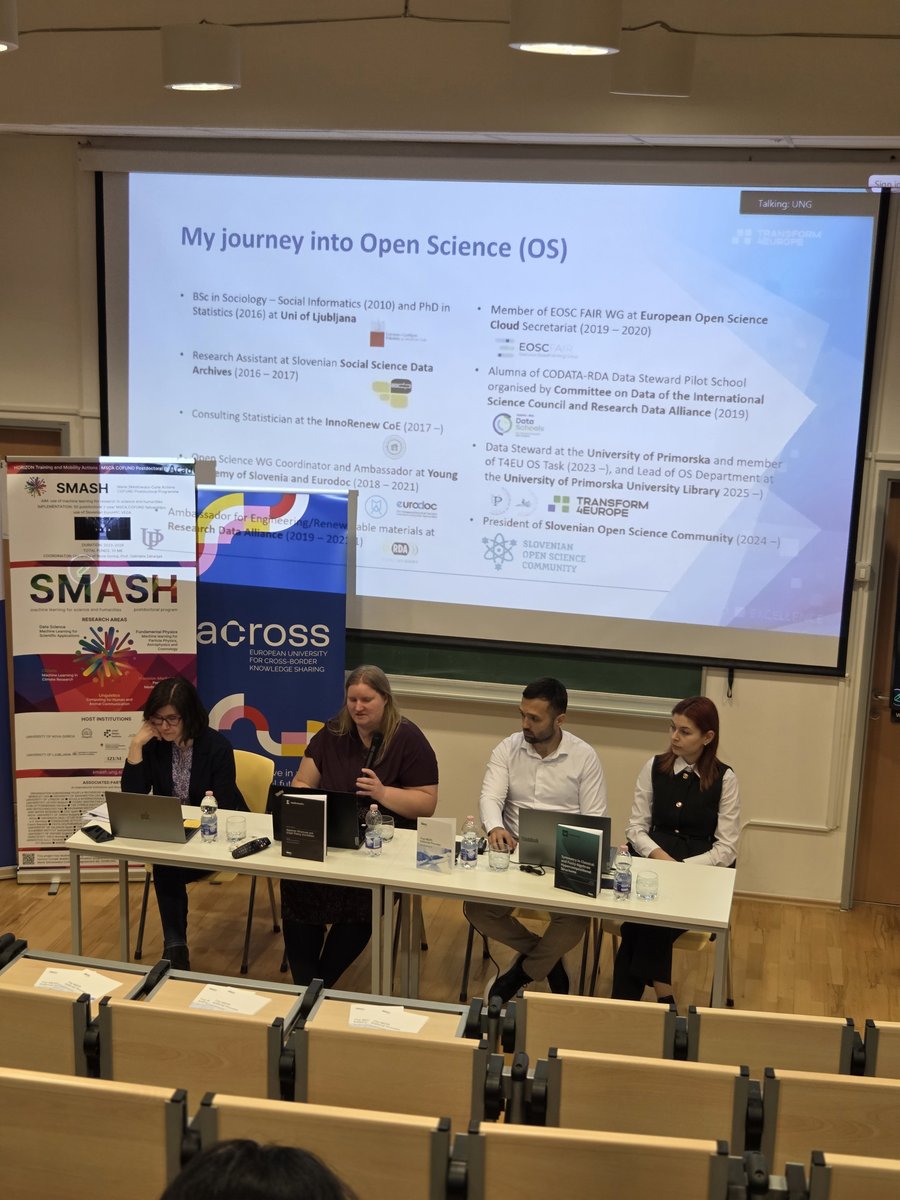 V uvodnem delu je prof. dr. Irina Elena Cristea s Centra za informacijske tehnologije in uporabno matematiko Univerze v Novi Gorici, predstavila delavnico o odprti znanosti, medtem ko je mag. Andreja Repič Agrež, koordinatorice pisarne Across na Univerzi v Novi Gorici, predstavila zavezništvo Across.
