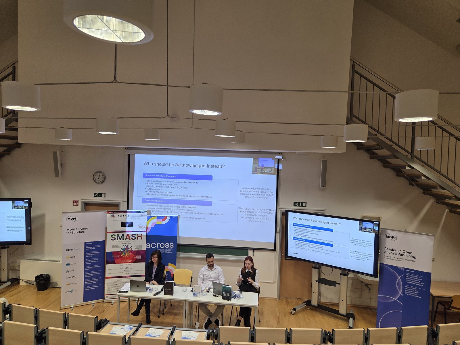 Drugi del se je osredotočal na odprto znanost in akademsko založništvo. Stefan Milojević, višji strokovnjak za odnose z revijami pri MDPI (Multidisciplinary Digital Publishing Institute), založniku odprtodostopnih znanstvenih revij, je govoril o glavnih načelih odprte znanosti, vlogi MDPI v odprti znanosti, ter o prihodnosti znanstvenega založništva. Dunja Mladenović, višja strokovnjakinja za odnose z revijami pri MDPI, je predavala o etičnih temeljih znanstvenega založništva in vse večjem vplivu umetne inteligence na raziskovalno integriteto.